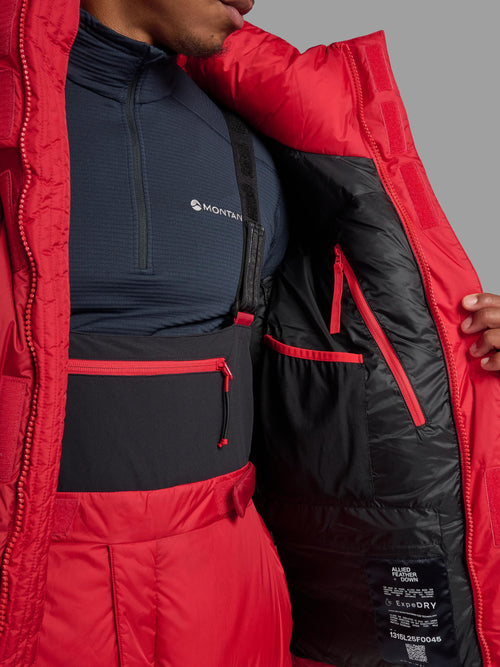 The Apex 8000 Down Jacket is filled with ExpeDRY™ Goose Down, which has non-toxic gold particles bonded to it for fast-drying performance and industry-leading warmth. The chemical-free technology works because gold particles vibrate water molecules, just like heat does, to speed up evaporation to a rate faster than the water absorption rate of down, while managing moisture from the body.