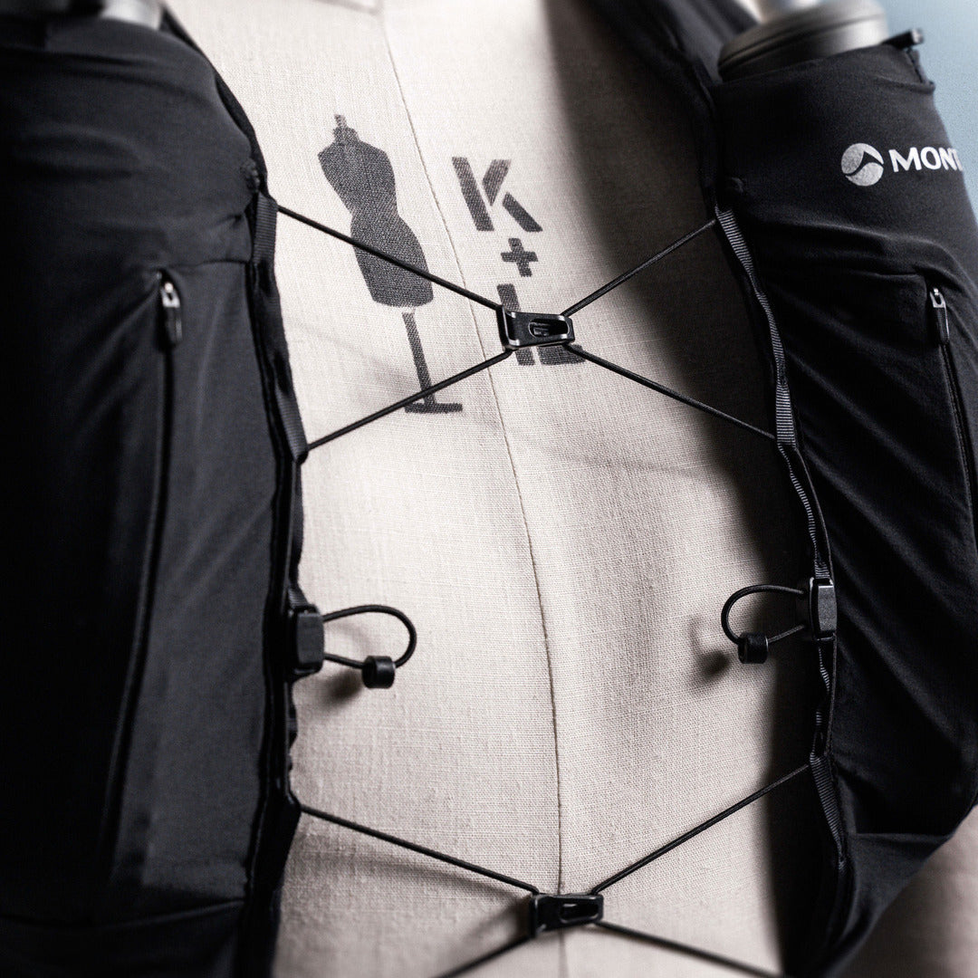 Multiple harness pockets for on-the-go access to kit, food and liquid. Locking zip heads keep zips closed while running