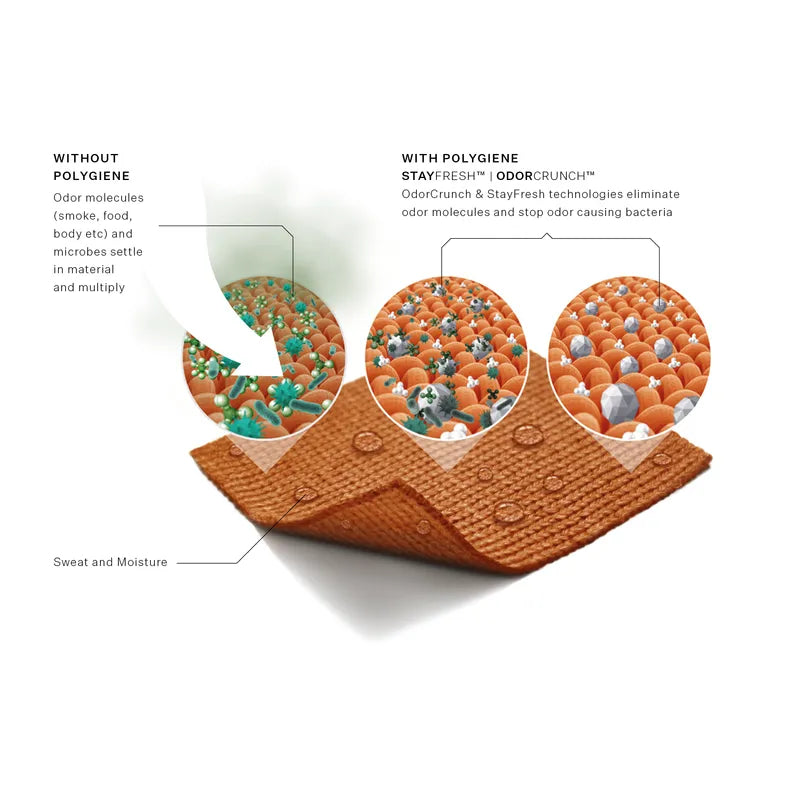 Polygiene StayFresh™ and OdorCrunch™ work together to keep products fresher for longer. StayFresh uses antimicrobial technology based on silver salts to inhibit the growth of odour-causing bacteria, preventing smells before they start. OdorCrunch takes a different approach, capturing and neutralising odour molecules at the source, rather than just masking them. Combined, these technologies help your pack stay clean, fresh, and ready to use for longer, reducing the need for frequent washing.