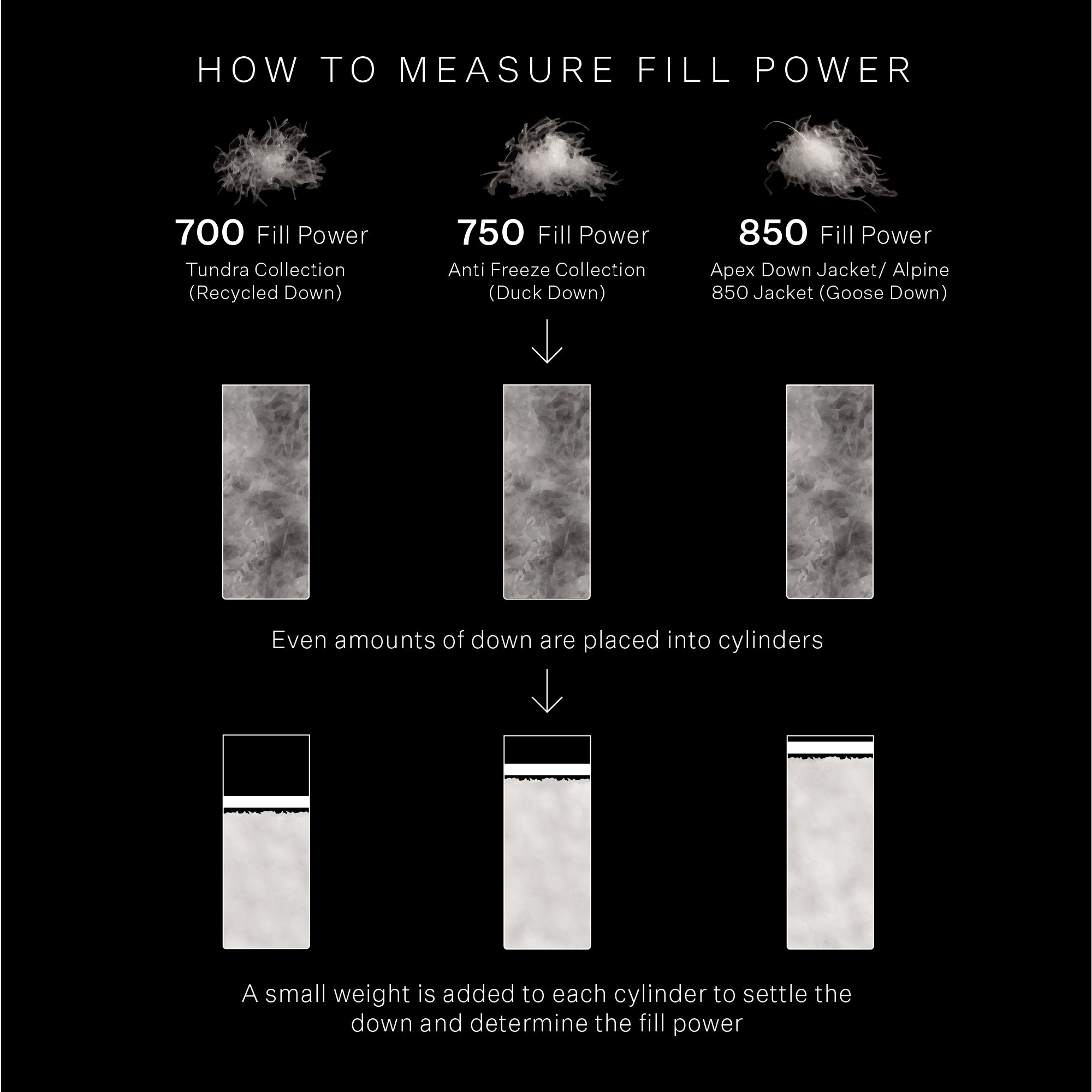 Fill power is important when it comes to thinking about down filling, as it’s one of the key characteristics that indicate the performance of the down (and in turn how warm it will keep you!). Fill power tests the volume in cubic inches that one ounce of down fills under pressure.