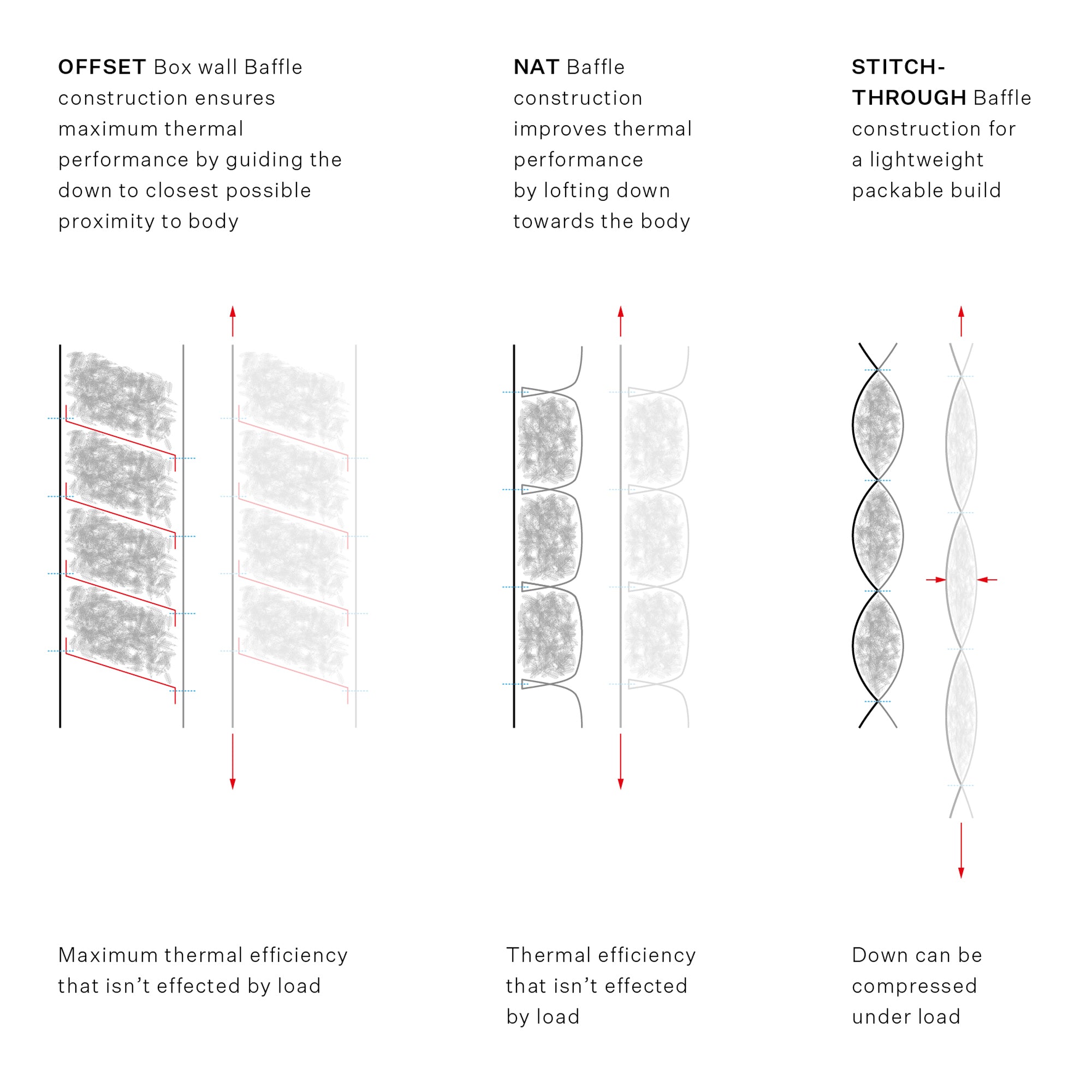 Our Kamen XT showcases OFFSET boxwall construction, which uses simple but effective design to ensure that the down is actively guided as close to the body as possible. This achieves maximum thermal efficiency without additional materials and weight.