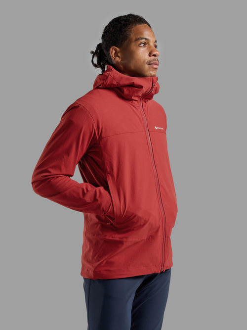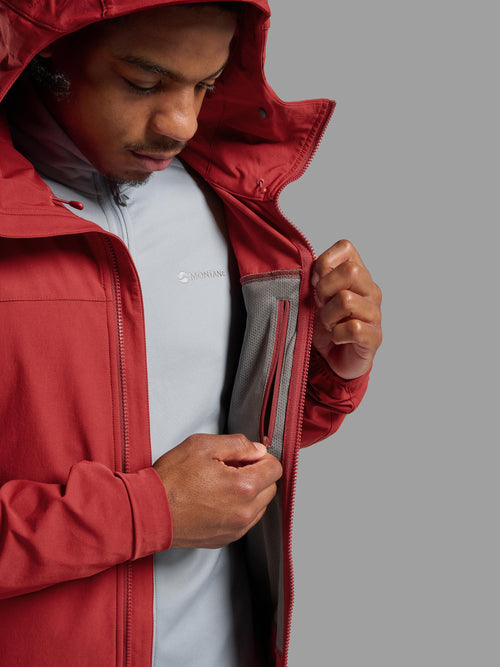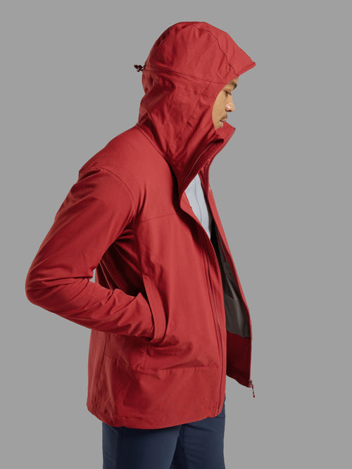 Constructed from GRANITE Stretch fabric, a double weave textile that maximises movement and comfort. This men's softshell jacket provides exceptional wind resistance and water repellence, coated in a non-fluorocarbon DWR. Its adjustable hood and hem offer a customisable fit, giving you optimal protection and ventilation in any weather.
