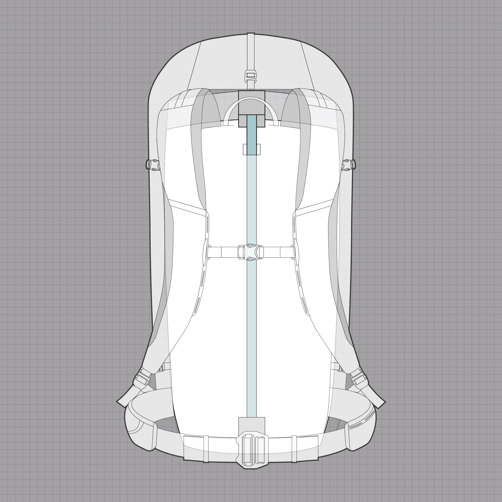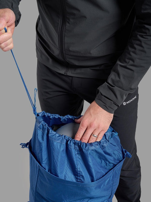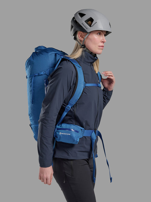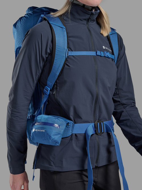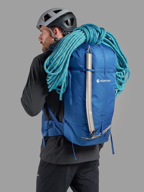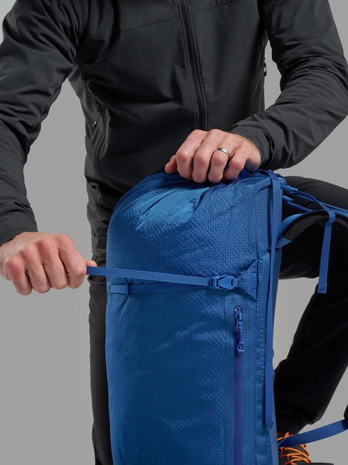 The continuous webbing construction throughout the multi-day pack provides 360 degree compression and stability to make sure your kit is secure on long days in the mountains. The back panel and harness are moulded and body formed with a pre-shaped aluminium stave for a close, secure load carry and excellent stability during dynamic activities